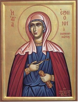 Παρθένος ἀκήρατος, διατελοῦσα σεμνή, τῷ Λόγῳ νενύμφευσαι, τῷ ἐκ Παρθένου Ἀγνῆς, σαρκί ὁμιλήσαντι· ὅθεν τήν σοί δοθεῖσαν, θεοπάροχον χάριν, ἄθλοις τῆς εὐσεβείας, τοῖς ἐν πλάνῃ ἐκφαίνεις· διό σε Ἑρμιόνη, ὁ Χριστός ἐδόξασε.