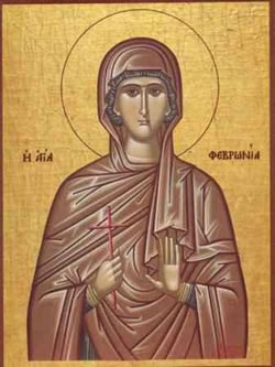 Παρθενίας χάρισι, καῖ μαρτυρίου τῷ κάλλει, κοσμηθεῖσα ἔνδοξε, ὡς πανακήρατος νύμφη, ἔδραμες, λαμπαδηφόρος τῷ σῷ Νημφίῳ, ἔστεψαι, τῆς ἀφθαρσίας τῇ εὐπρεπείᾳ, καί πρεσβεύεις Φεβρωνία, ὑπέρ τῶν πίστει ὑμνολογούντων σε.