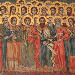 Στρατός θεοσύλεκτος, παρεμβολή ἱερά, νομίμως ἀθλήσαντες ὑπέρ τῆς δόξης Χριστοῦ, ἐν Πνεύματι ὤφθητε. Μάρτυρες τοῦ Κυρίου, Τεσσαράκοντα πέντε, λύσαντες δι’ ἀγώνων, τήν πολύθεον πλάνην· διό ἡμῶν τούς ἀγῶνας, πάντες δοξάζομεν.