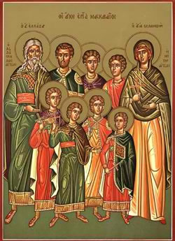 Τῶν Μακκαβαίων τόν ἑπτάριθμον δῆμον, σύν τῇ μητρί Σολομονῇ τῇ ἁγίᾳ, καί Ἐλεάζαρ ἅμα εὐφημήσωμεν· οὗτοι γάρ ἠρίστευσαν, δι’ ἀγώνων νομίμων, ὡς φρουροί καί φύλακες, τῶν τοῦ Νόμου δογμάτων· καί νῦν ὡς καλλιμάρτυρες Χριστοῦ, ὑπέρ τοῦ κόσμου, ἀπαύστως πρεσβεύουσι.