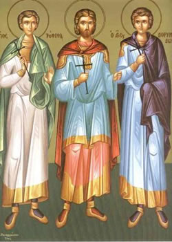 Δόξῃ λαμπρυθέντες Τριαδικῇ, Τρόφιμος ὁ θεῖος, Δορυμέδων ὁ εὐκλεής, σύν τῷ Σαββατίῳ, μαρτυρικοῖς ἀγῶσι, τῆς πίστεως τό κάλλος, ὡς λύχνοι ἔφαναν.