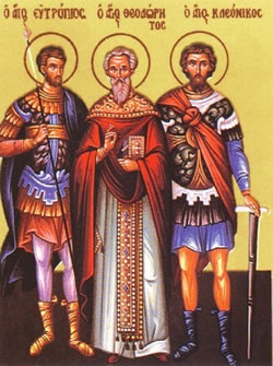 Χαίροις τῶν Μαρτύρων τριάς κλυτή, τρίφωτε λυχνία, Τρισηλίου μαραρμαρυγῆς, Εὐτρόπιε μάκαρ, Κλεόνικε θεόφρον, μετά τοῦ Βασιλίσκου· οὓς μακαρίσωμεν.