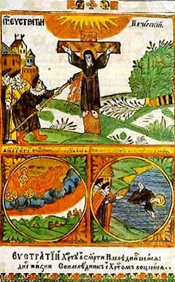 Ὅσιος Εὐστράτιος, ἀπόγονος μιᾶς πλούσιας οἰκογένειας τοῦ Κιέβου, διέθεσε στούς πτωχούς ὅλα τά πλούτη του καί ἐγκαταβίωσε στή Λαύρα τῶν Σπηλαίων τοῦ Κιέβου, ὅπου ἀφιερώθηκε στήν ἄσκηση καί τή νηστεία. Στίς εἰκόνες περιγράφεται μέ ἀνοιχτοῦ χρώματος μαλλιά, ἀραιή γενειάδα, ντυμένος μέ τό μοναχικό ράσο καί ἀνυπόδητος.