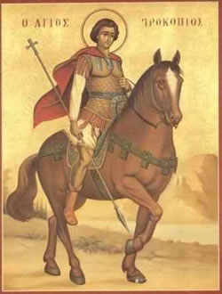 Τῷ ζήλῳ Χριστοῦ, τῷ θείῳ πυρπολούμενος, καί τῇ τοῦ Σταυροῦ, ἰσχύϊ συμφραξάμενος, τῶν ἐχθρῶν τό φρύαγμα, καί τό θράσος καθεῖλες Προκόπιε, καί τήν Ἐκκλησίαν ὕψωσας, τῇ πίστει προκόπτων καί φωτίζων ἡμᾶς.