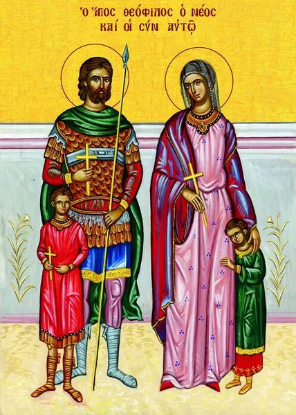 Ἅγιος Θεόφιλος μαρτύρησε μέ τήν οἰκογένειά του στήν Κρήτη. Στό α’ στιχηρό τοῦ Ἑσπερινοῦ ὑπάρχει πληροφορία περί τοῦ μαρτυρίου τῆς συζύγου του: «…καί νυμφῶνος θείου ἐχώρησας ἔνδον, νενυμφευμένην τῷ Χριστῷ διά βασάνων τοῦ σώματος τήν σύζυγον ἀγόμενος…». Στό α’ τροπάριο τῆς γ’ Ὠδῆς τοῦ Κανόνος γίνεται λόγος περί μαρτυρίου καί τῶν τέκνων του. Προφανῶς ἔχουμε περίπτωση οἰκογενειακοῦ μαρτυρίου ἀνάλογο πρός ἐκείνου τοῦ Ἁγίου Μεγαλομάρτυρος Εὐσταθίου († 20 Σεπτεμβρίου) καί τοῦ Ἁγίου Ἑσπέρου († 2 Μαΐου). Πιθανότατα οἱ Ἅγιοι μαρτύρησαν κατά τήν ἐποχή τῶν διωγμῶν τῆς ἀρχαίας Ἐκκλησίας.