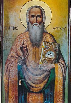 Καρπασέων τὸ κλέος καὶ Κυπρίων ἀγλάϊσμα, καὶ θαυματουργὸς ἀνεδείχθης, Θύρσε ἱεράρχα ἀοίδιμε, νηστεία, ἀγρυπνία, προσευχή, οὐράνια χαρίσματα λαβῶν, θεραπεύεις τοὺς νοσοῦντας, καὶ τὰς ψυχὰς τῶν πίστει προστρεχόντων σοι. Δόξα τῷ δεδωκότι σοι ἰσχὺν, δόξα τῷ σὲ στεφάνωσαντι, δόξα τῷ ἐνεργοῦντι διὰ σοῦ πᾶσιν ἰάματα.