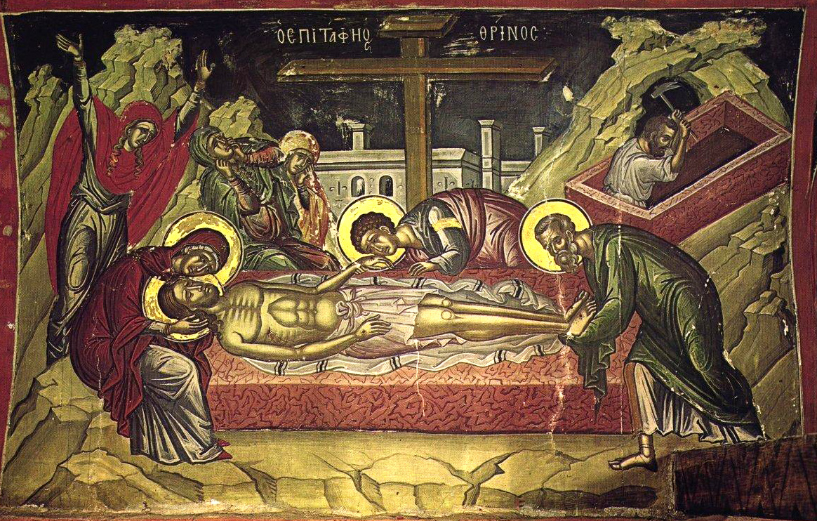 Ὁ εὐσχήμων Ἰωσήφ, ἀπὸ τοῦ ξύλου καθελών, τὸ ἄχραντόν σου σῶμα, σινδόνι καθαρᾷ εἰλήσας καὶ ἀρώμασιν, ἐν μνήματι καινῷ κηδεύσας ἐπέθετο.