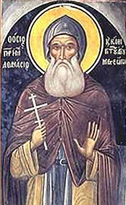 Τά ἄνω ποθῶν, τήν κλίμακα ἐτέκτηνας, τά κάτω μισῶν, σαργάνην Πάτερ ἔπλεξας, δι’ ὧν πρός ὕψος ἔδραμες, ἀπαθείας σοφέ Ἀθανάσιε· ἐν ὑψηλῇ γάρ πέτρᾳ τό φῶς, ὁσίων ἐκλάμπεις ἀρετῶν τοῖς ἐν γῇ.