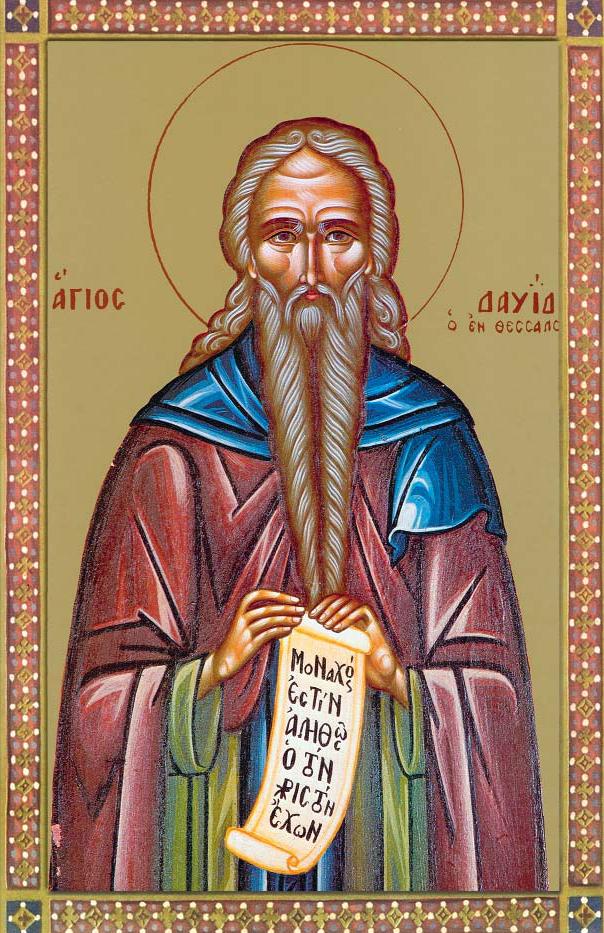 Ὡς φοῖνιξ ἐξήνθησας, τῶν ἀρετῶν τούς καρπούς, ἀσκήσας ὡς ἄσαρκος, ἀμυγδαλῆς ἐν φυτῷ, Δαβίδ Πάτερ Ὅσιε. Ὅθεν Θεσσαλονίκη, τοῖς ὁσίοις σου πόνοις, χάριν παρά Κυρίου, δαψιλῆ καρπουμένη, γεραίρει ὡς μεσίτην σε, θερμόν πρός τόν Φιλάνθρωπον.