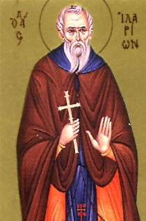 Ἱλαρότητι τρόπων καλλωπιζόμενος, ὡς καθαρώτατον σκεῦος τῆς ἐπιπνοίας Χριστοῦ, τῆς ἐνθέου βιοτῆς ἐδείχθης ἔσοπτρον· ὅθεν ἀστράπτεις νοητῶς, ἀρετῶν μαρμαρυγάς, Πατήρ ἡμῶν Ἱλαρίων, πρός ἀπλανῆ ὁδηγίαν, καί σωτηρίαν τῶν ψυχῶν ἡμῶν.