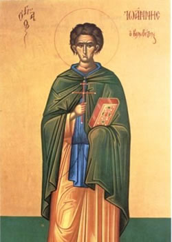 Ἐκ βρέφους τόν Κύριον, ἐπιποθήσας θερμῶς, τόν κόσμον κατέλιπες, καί τά ἐν κόσμῳ τερπνά, καί ἤσκησας ἄριστα· ἔπηξας τήν καλύβην, πρό πυλῶν σῶν γονέων· ἔθραυσας τάς ἐνέδρας, τῶν δαιμόνων παμμάκαρ· διό σε Ἰωάννη ὁ Χριστός, ἀξίως ἐδόξασε.