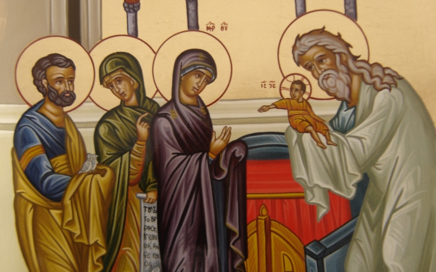 Χαίροι ὁ πρεσβύτατος Συμεών, ἐγγίζοντα βλέπων, τόν Δεσπότην ἐν τῷ Ναῷ· ὅθεν ἐπισπεύδει, αὐτόν ὑποδεχθῆναι, προεορτίως ᾄδων ὕμνον ἐπάξιον.