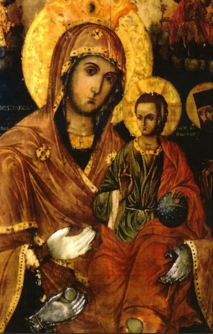 Θεομάνα Παρθένε και Οδηγήτρια, Κουκουζέλησα Θεία και Τρίχερούσα, Σεπτή, Πορταϊτισσα κλεινή Ευαγγελίστρια, σκέπην άπλωσον την σην επί Κίον μητρικώς διαφυλάττουσα ταύτην εκ παντοίων κινδύνων και πειρασμών του πολεμήτορος.