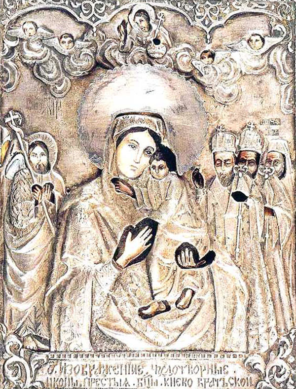 Το 1662 μ.Χ., όταν οι Τάταροι εισέβαλαν στην πόλη του Βίσγκο - Ροντ, κατέστρεψαν το ναό στον οποίο ετιμάτο η εικόνα της Παναγίας και έριξαν στο ποτάμι την εικόνα. Αυτή, επιπλέοντας επάνω στο νερό, έφθασε μέχρι το μοναστήρι Μπράτσκιυ (=των Αδελφών). Οι Πατέρες της μονής με πνευματική χαρά βρήκαν την εικόνα και με ευλάβεια την μετέφεραν στο μοναστήρι τους.