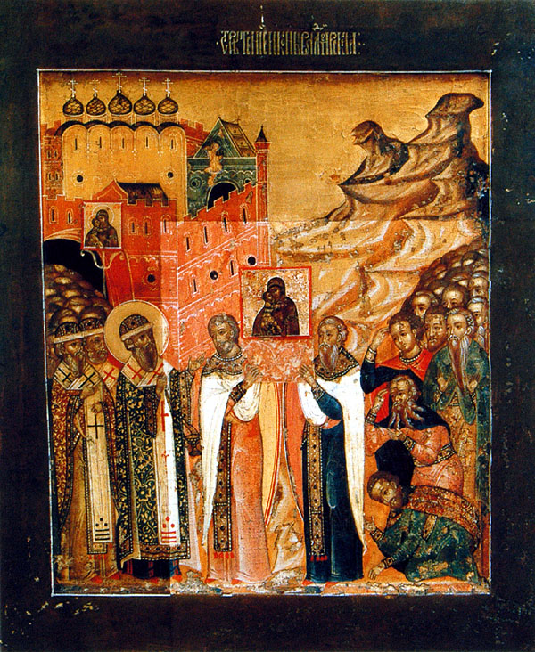 παράδοση αποδίδει την ιστόρηση της ιεράς εικόνος της Παναγίας του Βλαδιμήρου στον Ευαγγελιστή Λουκά, της οποίας αντίγραφο του πρωτοτύπου βρισκόταν στο ναό της Ελεούσας Κωνσταντινουπόλεως, που κτίσθηκε από τον αυτοκράτορα Ιωάννη Β' Κομνηνό (1118 - 1143 μ.Χ.). Η εικόνα μεταφέρθηκε από την Κωνσταντινούπολη στο Κίεβο, περί το 1131 μ.Χ., ως γαμήλιο δώρο στο μεγάλο πρίγκιπα Βλαδίμηρο.